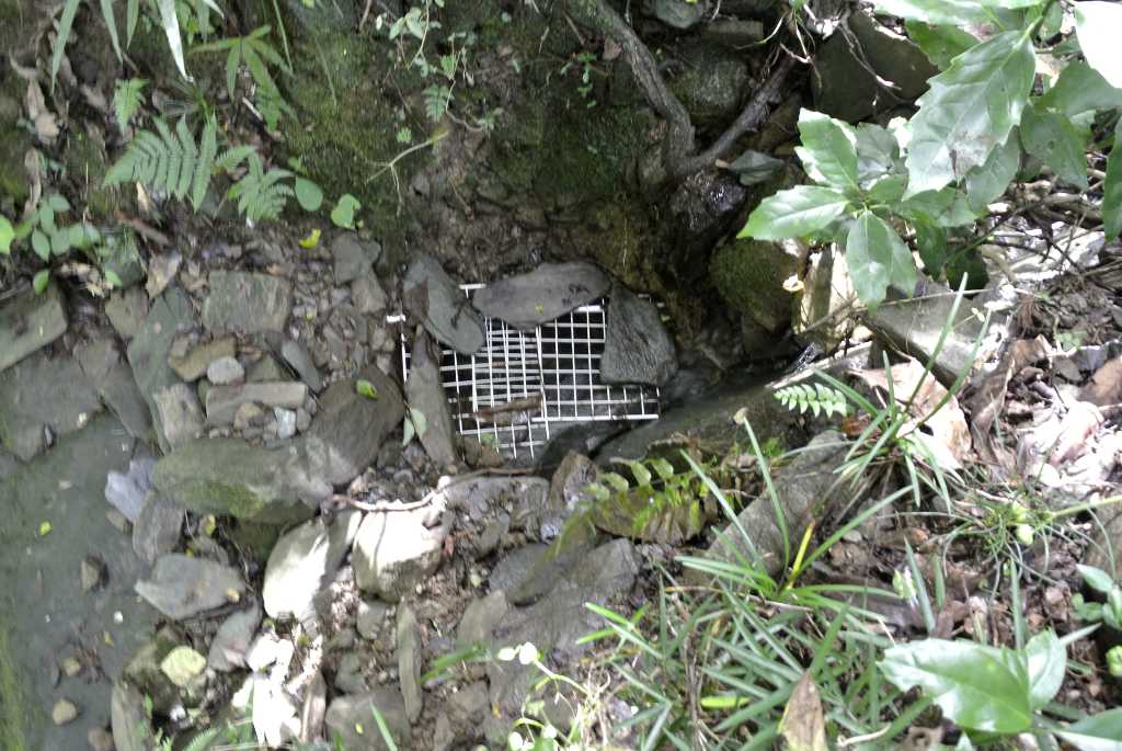 水がどうなってるのか改めて確認すべく遡ってみたら、パイプのすぐ上の辺りに枡があって、格子がかかっていました。沢もありますが、枡の水=沢水のようにも見えず詳細はわかりません。