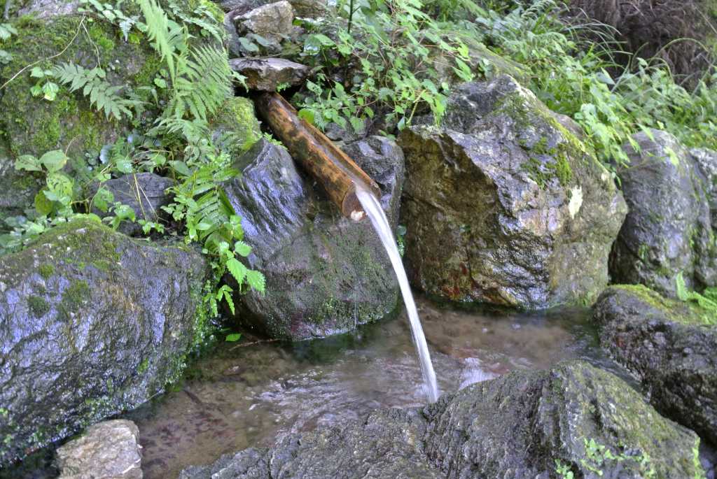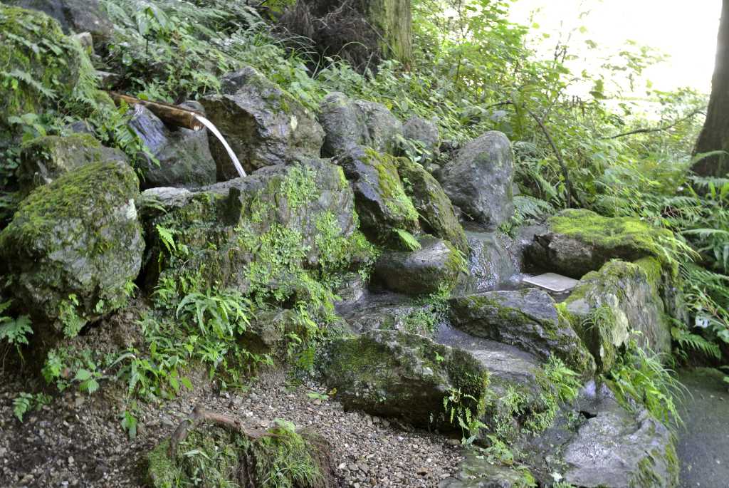 石で水が溜まる場所が2か所ありますが、水汲みは一番上の樋から。