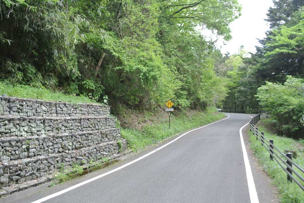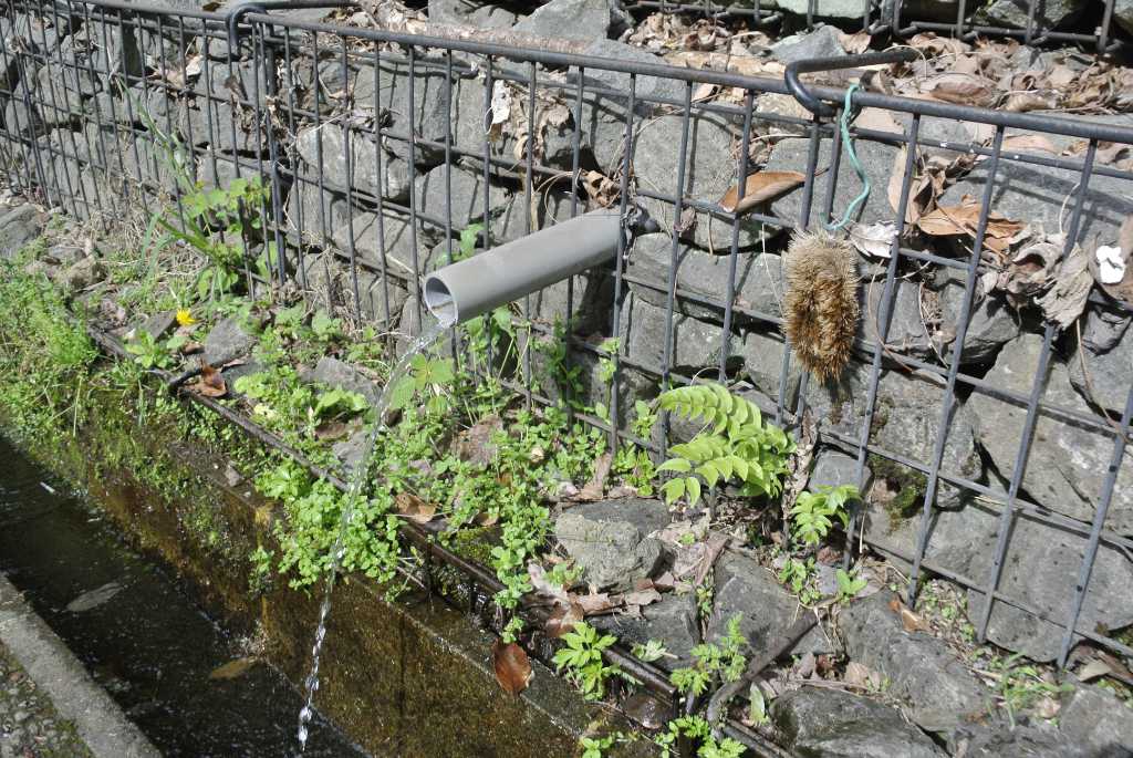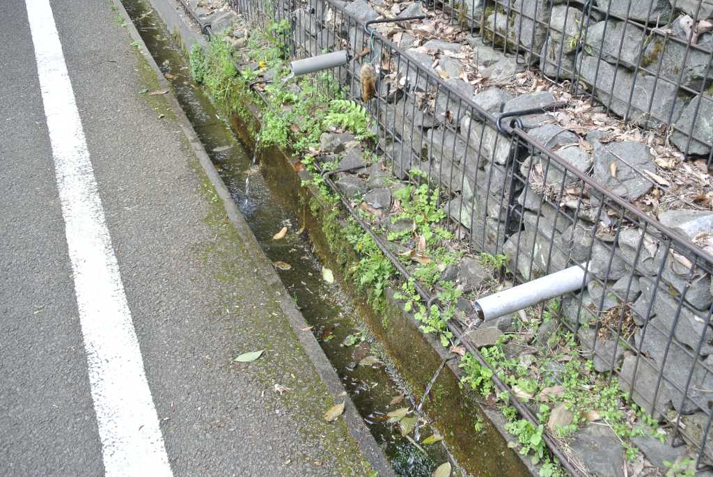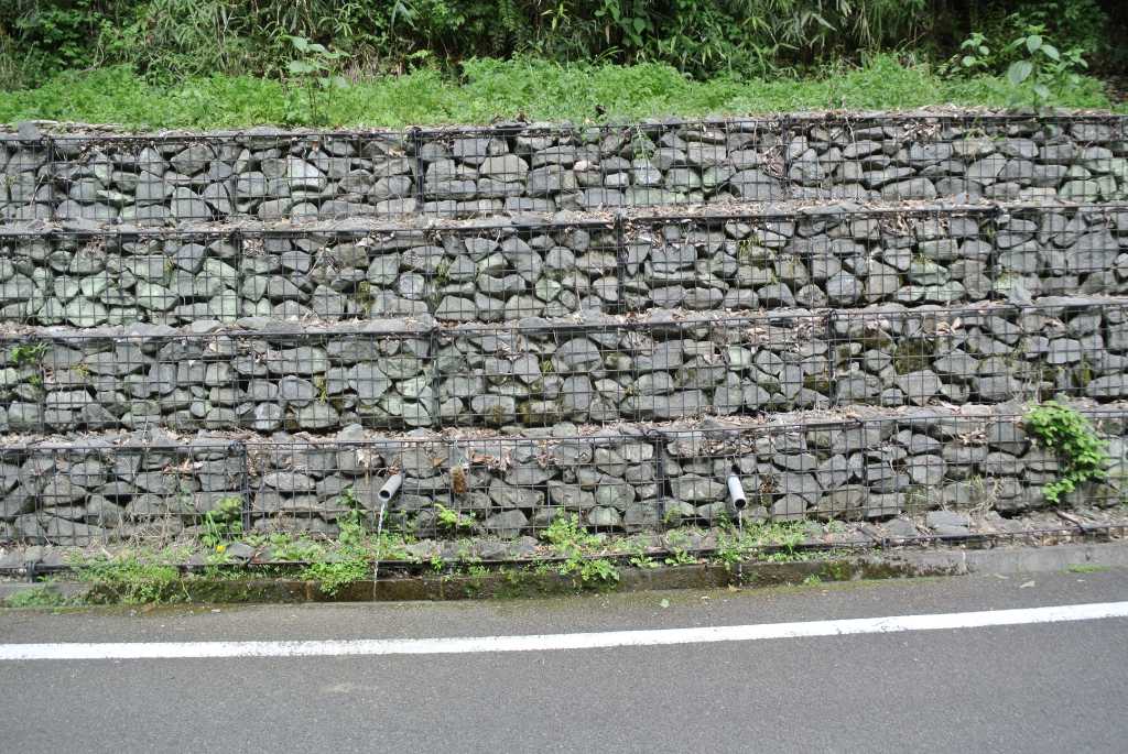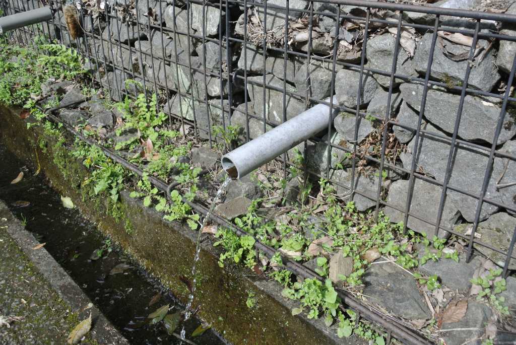 4段のかご工は見た目も新しく、整然としています。一番下の段のパイプ2本から水が出ており、水はそのまま側溝へ落ちています。