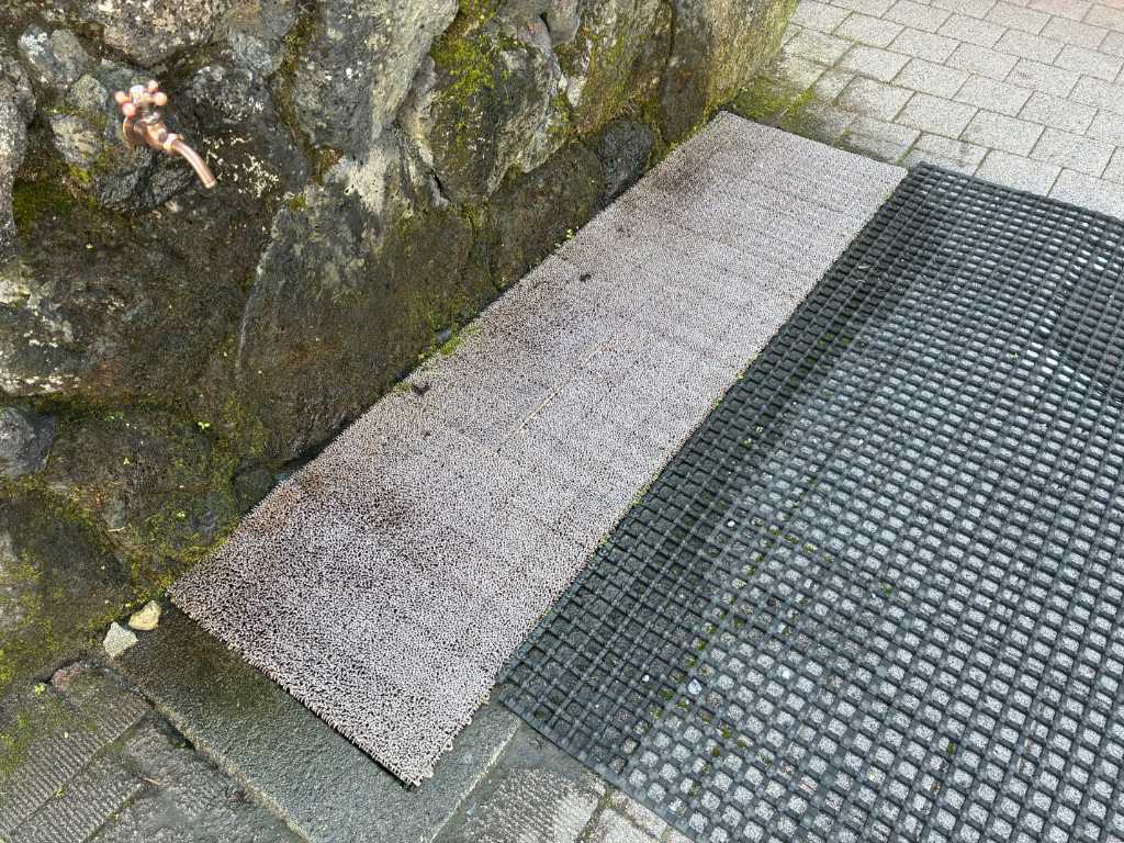 採水口は蛇口式が3つで間隔も広く、複数名が同時に水汲みをしても隣が気になりません。足元には滑り止めのシートが敷いてあり、全体的に水汲みしやすい配慮がなされています。蛇口の位置が少し高いのでポリタンクだとコツがいるかもしれません。